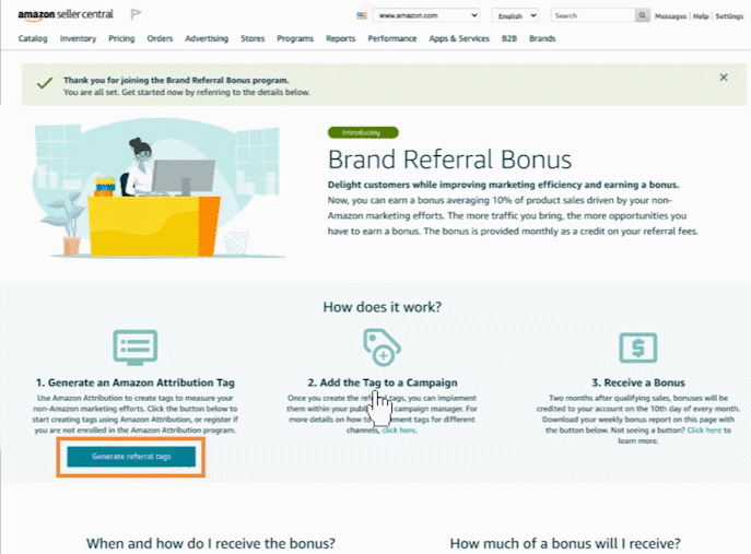 如果你已经为站外推广活动设置了Amazon Attribution标签,你只要确保标签的正确应用即可。如果你没有使用过Amazon Attribution,则点击页面上的“Generate Referral Tags”,按照指引进行注册。