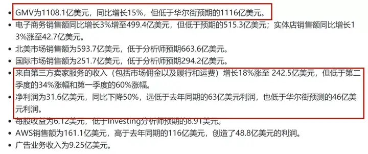 AMZ123获悉,亚马逊正式发布了第三季度财报。报告期内,亚马逊GMV达1108。1亿美元,较去年同期增长15%,未达到1116亿美元的市场预期;实现净利润31.6亿美元,较去年同期63亿美元下降50%,低于华尔街预测的46亿美元。