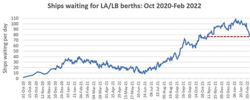 周二,在洛杉矶港和长滩港等待泊位的集装箱船数量下降到了78艘,创下三个月来的新低。