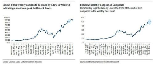 高盛在其最新的《供应链拥堵跟踪》报告中注意到了类似的现象,其每周拥堵指数按周下降了5.1%。
