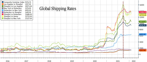 知名财经博客网站zerohedge则表示,目前华尔街越来越多的人正达成共识——全球供应链的限制可能已经达到顶峰,摩根大通便是其中的代表。这方面的一个领先指标是:最近几个月的主要航运费率正开始回落。